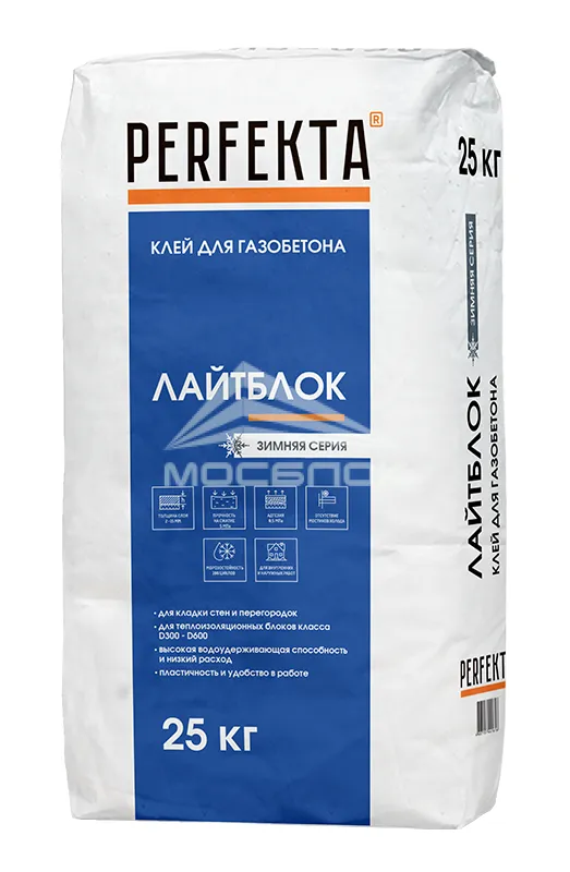 КЛЕЙ МОНТАЖНЫЙ Perfekta® “ЛАЙТБЛОК” ЗИМНЯЯ СЕРИЯ обладает высокой водоудерживающей способностью и пластичностью, что делает материал удобным в работе. Тонкий шов кладки предотвращает возникновение термических мостиков между блоками. Предназначен для внутренних и наружных работ.