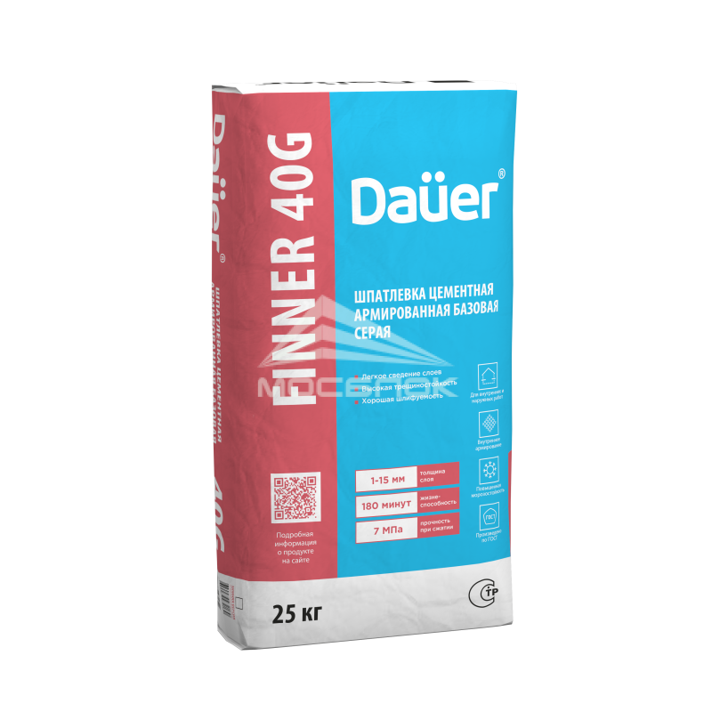 Шпатлевка цементная армированная Dauer FINNER EXTER 40G базовая серая 180/7,0/F50, 25 кг в городе Воронеж отличается быстрым временем высыхания — обычно в пределах 2-3