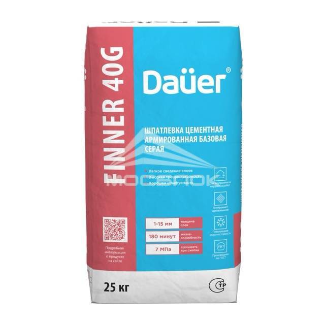 Шпатлевка цементная армированная Dauer FINNER 40G базовая серая 180/7,0/F50, 25 кг в городе Воронеж отличается быстрым временем высыхания — обычно в пределах 2-3