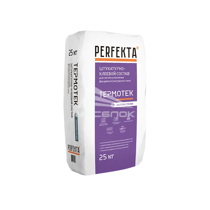 ШТУКАТУРНО-КЛЕЕВОЙ СОСТАВ Perfekta® "ТЕРМОТЕК" ЗИМНЯЯ СЕРИЯ предназначен для выполнения работ при отрицательных температурах по монтажу всех видов теплоизоляционных пенополистирольных и минераловатных плит и создания армированного базового штукатурного слоя при устройстве систем фасадных теплоизоляционных композиционных (СФТК) с тонким штукатурным слоем, а также иных конструкций с применением теплоизоляционных плит внутри и снаружи зданий.