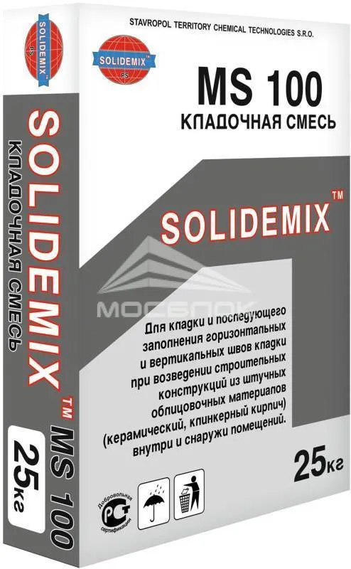 Кладочная смесь SOLIDEMIX MS 100 серая — это фундамент любого кирпичного или каменного сооружения. Правильный подбор состава, пропорций и соблюдение технологий позволяют добиться высокой прочности, долговечности и эстетики зданий. Современные добавки и технологии позволяют оптимизировать расход материалов и повысить эксплуатационные характеристики кладочных смесей производителя SOLIDEMIX.