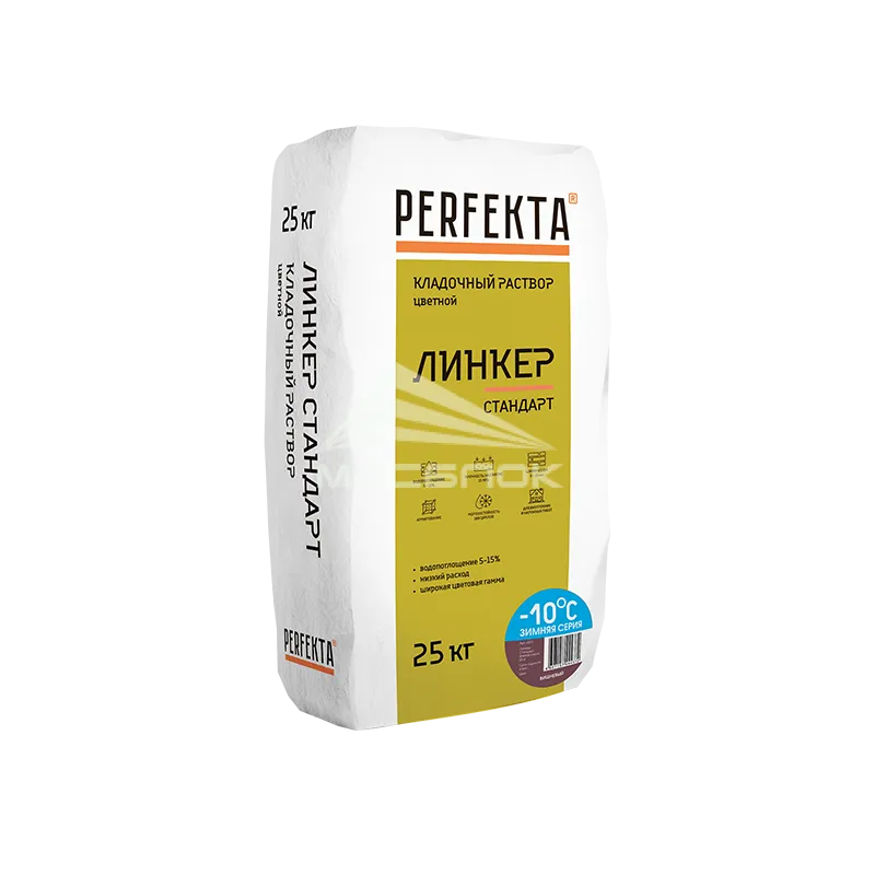Кладочный раствор Perfekta Линкер Стандарт Зимняя серия вишневый, 25 кг — это фундамент любого кирпичного или каменного сооружения. Правильный подбор состава, пропорций и соблюдение технологий позволяют добиться высокой прочности, долговечности и эстетики зданий. Современные добавки и технологии позволяют оптимизировать расход материалов и повысить эксплуатационные характеристики кладочных смесей производителя Perfekta зима.